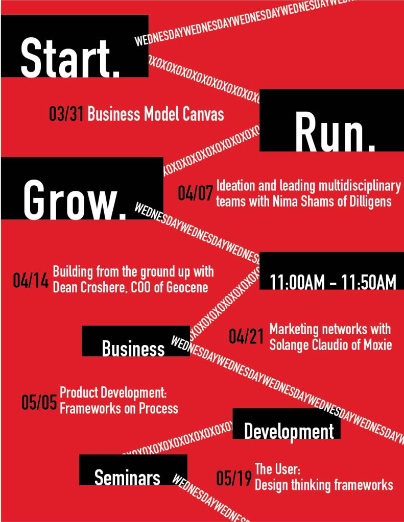 Two iterations and then the final iteration of a project where I redesigned an already existing poster for the UC Davis student startup center. While the first two iterations are in no way complete, I always love to see the thought process of designers and the wealth of ideas they drafted, and I thought their contrast with the final poster was interesting. The black and red in the final poster is really eye-catching and dynamic to draw the eyes of passersby and entices entrepreneurs with the Start. Run. Grow. slogan while the white contrast makes the dates readable.